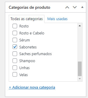 Selecione Categorias de Produtos, e selecionar qual categoria deseja adicionar