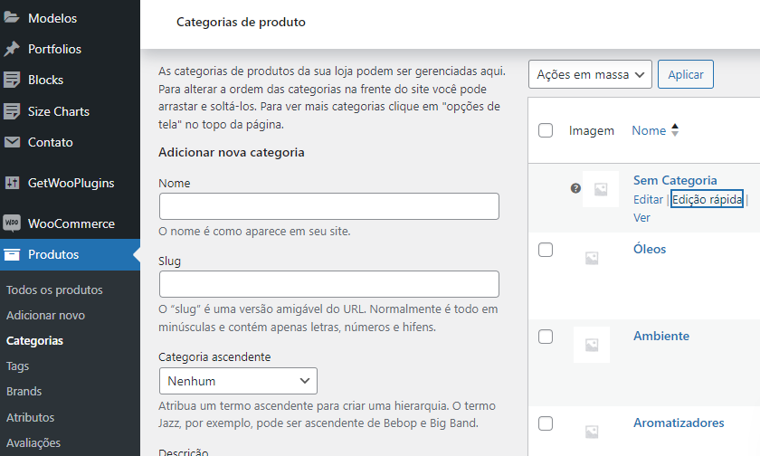Você pode criar aqui suas Categorias e também Editá-las (passe o Mouse que habilita a opção de Editar)