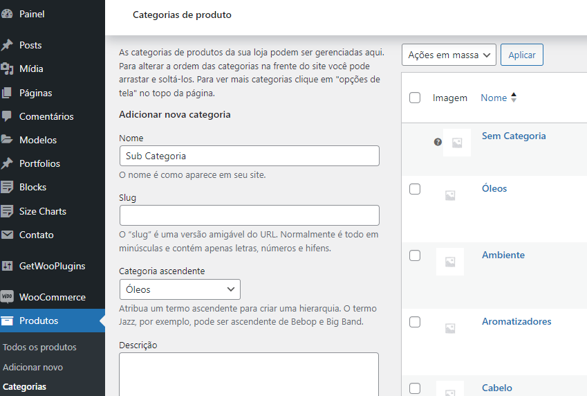 É como você vai organizar os produtos, vamos mostrar mais abaixo como você usa as Sub Categorias
