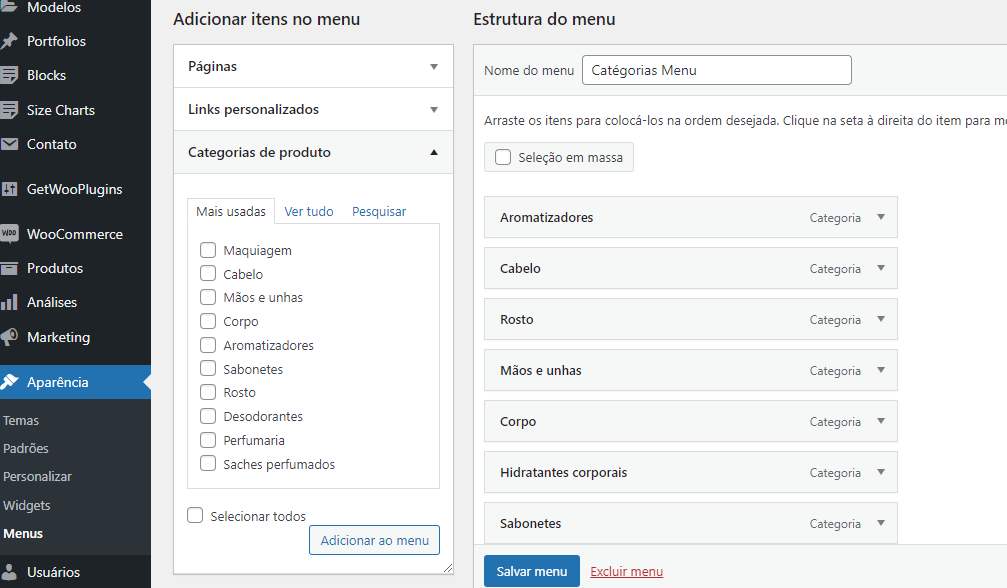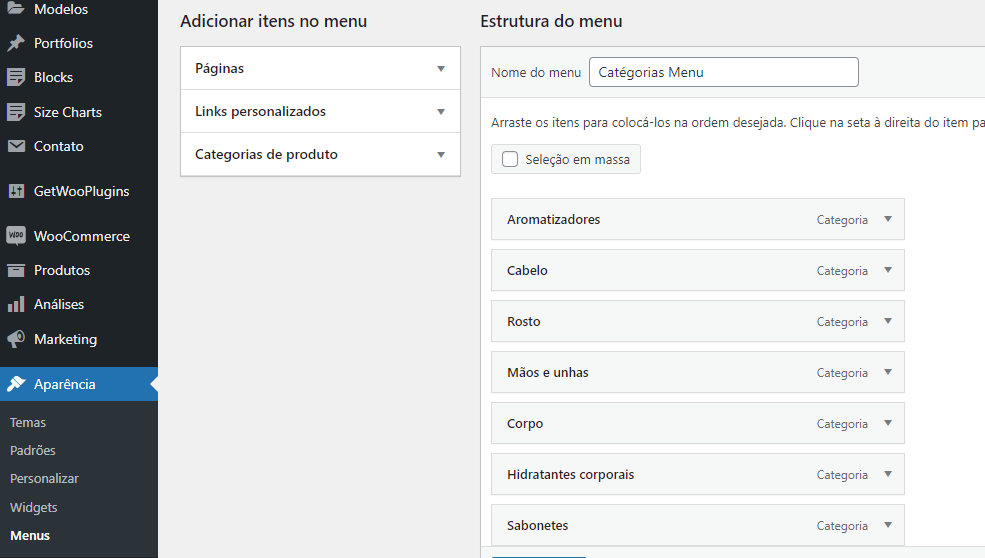 Vá no Menu: Aparência | Menus