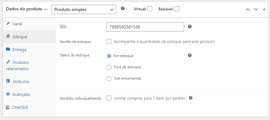 • Gestão de estoque – Se habilitar o você tem a opção incluir quantidade de estoque
