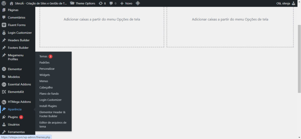 1) Com o seu painel aberto, vá à barra de tarefas do WordPress, do lado esquerdo da tela. Localize a área “Aparência” e selecione “Elementor Header and Footer Builder”.