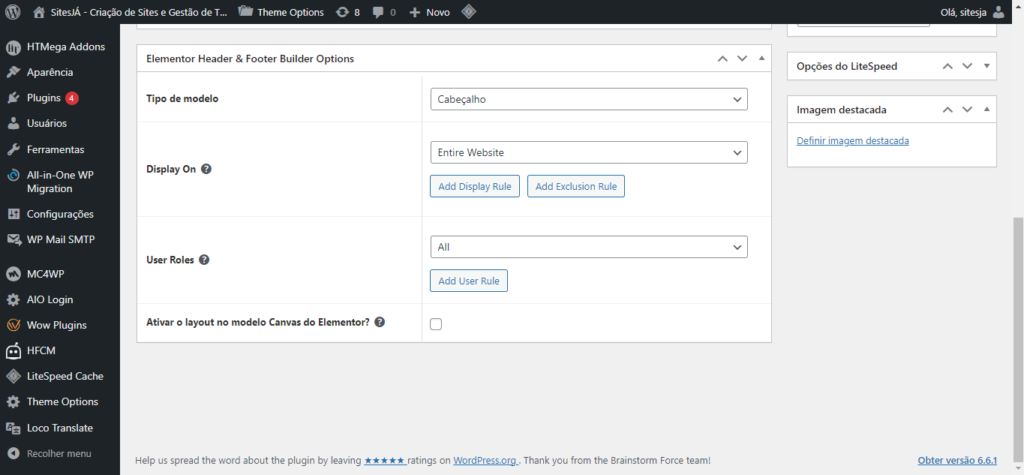Display On: Aqui você irá selecionar as páginas que a header fosse apresentada. Certifique-se de ler com atenção para entender cada uma das opções. Nessa mesma opção você pode selecionar a opção “Add Exclusion Rule”, que permite que você (quando necessário) selecione as páginas que você não quer que ela apareça.
