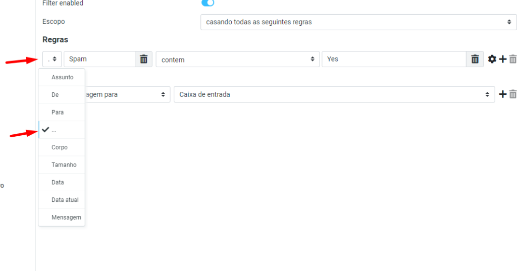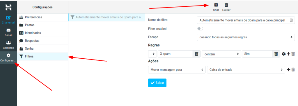 Para desabilitar completamente a filtragem de Webmail para que todos os e-mails sejam direcionados para a caixa de entrada em vez de serem movidos para a caixa de Spam, configure um filtro dentro do painel do webmail assim: